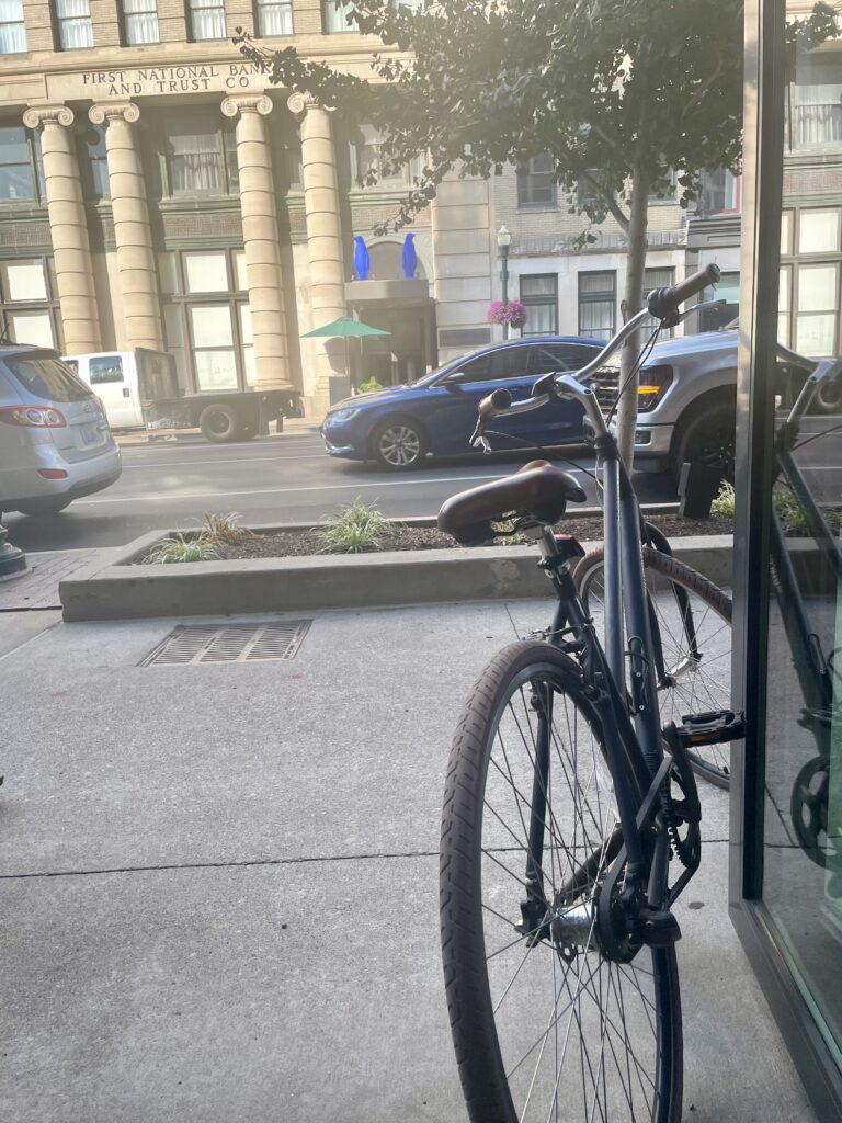 Fast forward to Steph and Jules now chilling at the hotel. he’s hatching plans with some fraternity later tonight. move in isn’t till 1:30 tmrw. So what’s the big rush I guess you could say? I don’t know. I’m paying out the nose for all this. I want to soak it in as best I can. But truth be told, the money is really secondary. Maybe it’s some unconscious anxiety about my son truly going off to college. a lot of roads have taken us here. I’m excited. For him. For us. But mostly for me I guess. I grabbed the hotel bike just as soon as we got here and went on a ride around town